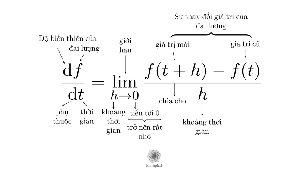 Trên tử số chúng ta thấy độ thay đổi của hàm f; dưới mẫu số là độ thay đổi của x. Phương trình này định nghĩa f’(x) một cách duy nhất, nếu giới hạn tồn tại. Điều này cần phải được chứng minh cho bất kỳ hàm nào được xét đến: giới hạn tồn tại cho hầu hết các hàm thông thường như: bậc hai, bậc ba, các lũy thừa bậc cao hơn, logarit, hàm mũ, và các hàm lượng giác.
