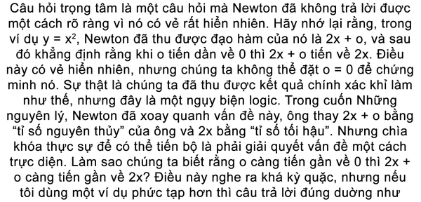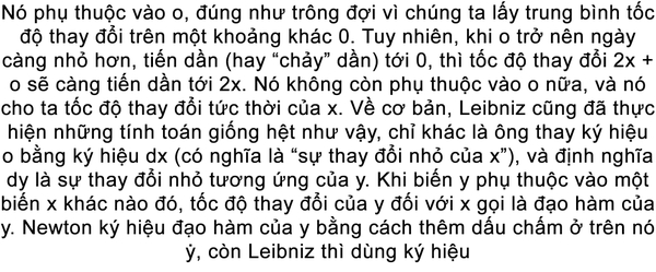 Khi các nhà toán học trở lại với logic của phép tính vi tích phân, họ nhận ra rằng câu hỏi trung tâm có vẻ như đơn giản này lại chính là trái tim của vấn đề. Khi chúng ta nói rằng o tiến gần đến 0, ta hàm ý rằng với bất kỳ số dương khác 0 nào, ta đều có thể chọn được o bé hơn số đó. (Điều này là hiển nhiên: lấy o bằng nửa số đó chẳng hạn). Tương tự, khi ta nói 2x + o tiến đến 2x, ta hàm ý rằng hiệu của chúng tiến tới 0, theo nghĩa vừa nói ở trên. Vì hiệu số đó, trong truờng hợp này, tình cờ lại chính bằng o, nên nó thậm chí còn hiển nhiên hơn: bất kể “tiến đến 0” mang ý nghĩa gì, thì cũng rõ ràng là o tiến đến 0 khi o tiến đến 0. Một hàm phức tạp hơn hàm bậc hai sẽ đòi hỏi phân tích phức tạp hơn.