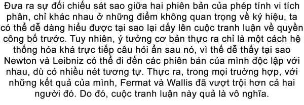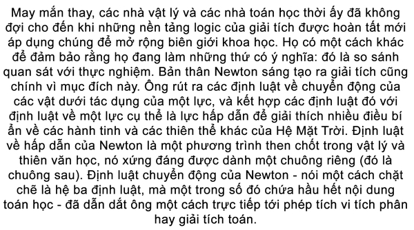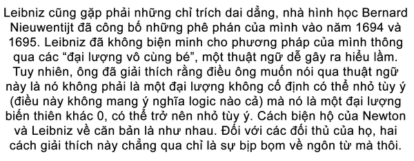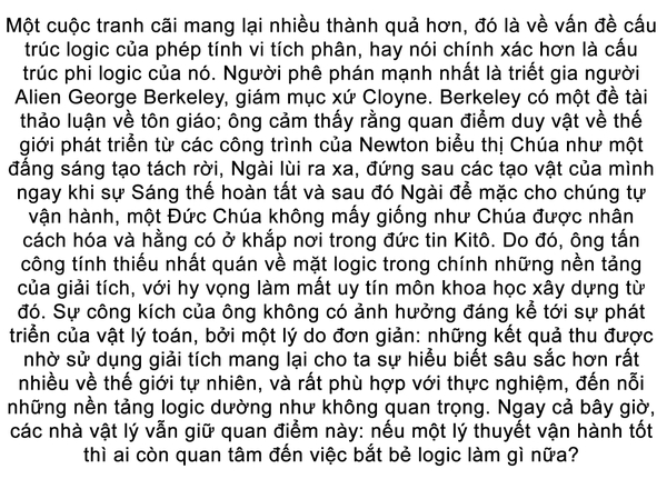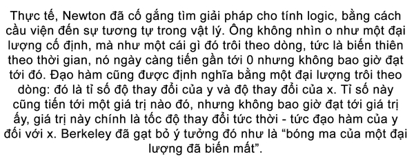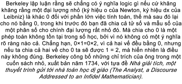 Vậy là phép tính vi tích phân đã vận hành. Nó đã giải được các bài toán trong vật lý và hình học, và đưa ra những câu trả lời chính xác. Nó còn dẫn ta tới các khái niệm vật lý mới và co bản như năng lượng và động lượng. Nhưng điều đó chưa trả lời được nghi vấn của Giám mục Berkeley. Phép tính vi tích phân cần phải vận hành như toán học, chứ không chỉ phù hợp với vật lý. Newton và Leibniz đều hiểu rằng cả o và dx không thể vừa bằng 0 vừa khác 0 được. Newton mệt mỏi cố thoát ra khỏi cái bẫy logic này bằng cách sử dụng hình ảnh vật lý của dòng chảy (fluxion). Leibniz thì nói về các đại lượng vô cùng bé. Cả hai đều ám chỉ đến các đại lượng tiến dần đến 0 nhưng không bao giờ đạt tới đó, vậy thì chúng là gì? Trớ trêu thay, sự chế giễu của Berkeley về “bóng ma của các đại lượng biến mất” lại gần như đã tiến sát tới lời giải của vấn đề này, nhưng cái mà ông đã không tính đến – điều mà cả Newton và Leibniz đều nhấn mạnh – đó là các đại lượng này biến mất bằng cách nào. Làm cho chúng biến mất một cách đúng đắn, là bạn có thể bỏ lại một bóng ma đã được hình thành một cách hoàn hảo. Nếu cả Newton và Leibniz trình bày trực quan của họ theo một ngôn ngữ toán học chặt chẽ, thì có lẽ Berkeley đã hiểu được những kết quả mà họ thu được.