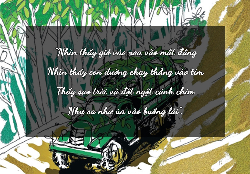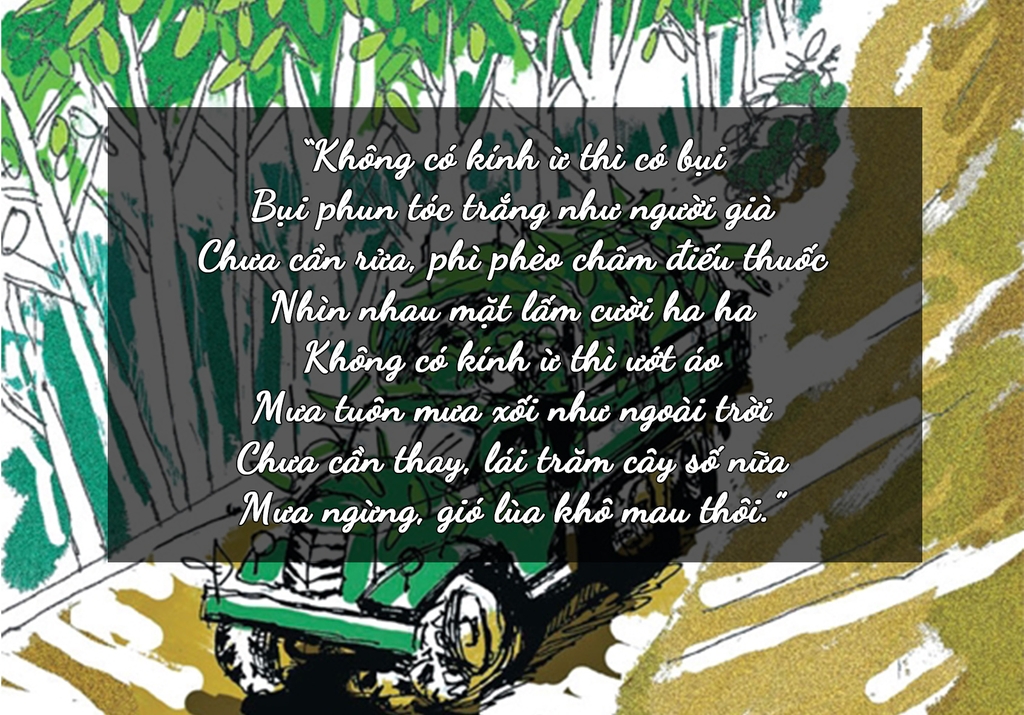 – Những chiến sĩ lái xe là những chàng trai trẻ vui tính, hóm hỉnh với những hình ảnh tinhnghịch “Chưa cần rửa, phì phèo châm điếu thuốc – Nhìn nhau mặt lấm cười ha ha”. Đó là khúc nhạc vui của tuổi 18, đôi mươi gợi cảm giác nhẹ nhõm, thanh thản xua tan những khó khăn, nguy hiểm.